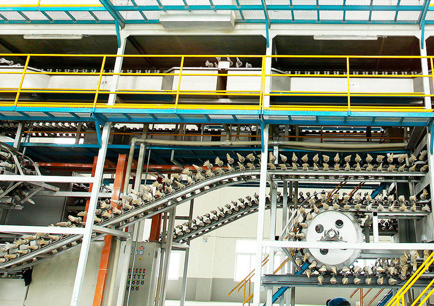 手套模型先经酸碱清洁、水清洗,洗净的模型先浸入热水加热后至浸凝固剂并干燥进行浸胶。浸胶后送烘箱初步烘干、加纤维内套、冲热水再送至烘箱硫化、烘干成型。手套脱模后充气检查、低温定型、中温干燥、水洗、脱水、烘干后再包装送成品仓库。